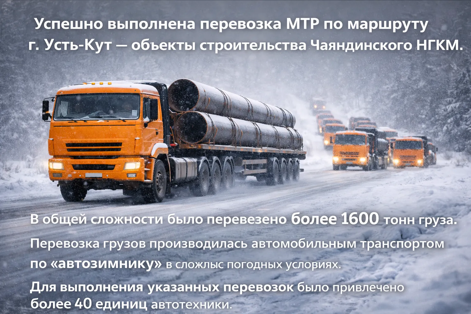 ООО "Рейлтэк" успешно выполнил перевозку МТР по маршруту г. Усть-Кут - Объекты строительство Чаяндинского НГКМ. В общей сложности было перевезено более 1600 тонн груза. Перевозка грузов производилась автомобильным транспортом по "автозимнику" в сложных погодных условиях. Для выполнения указанных перевозок было привлечено более 40 единиц авто техники. Весь груз был доставлен без повреждений, в максимально короткие сроки, в соответствии с поручениями ЗАО "СтройТрансГаз".